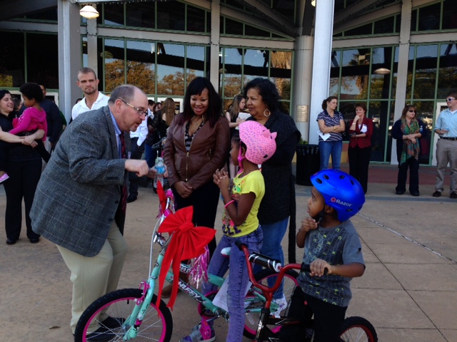 Fred, teaching the kiddos how to ride their new bike gifts at the Responsible Parenting Awards